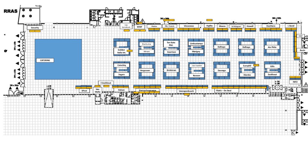 Zaalplan met de aanwezige handelaars en standhouders op Antwerpfila van oktober 2025.